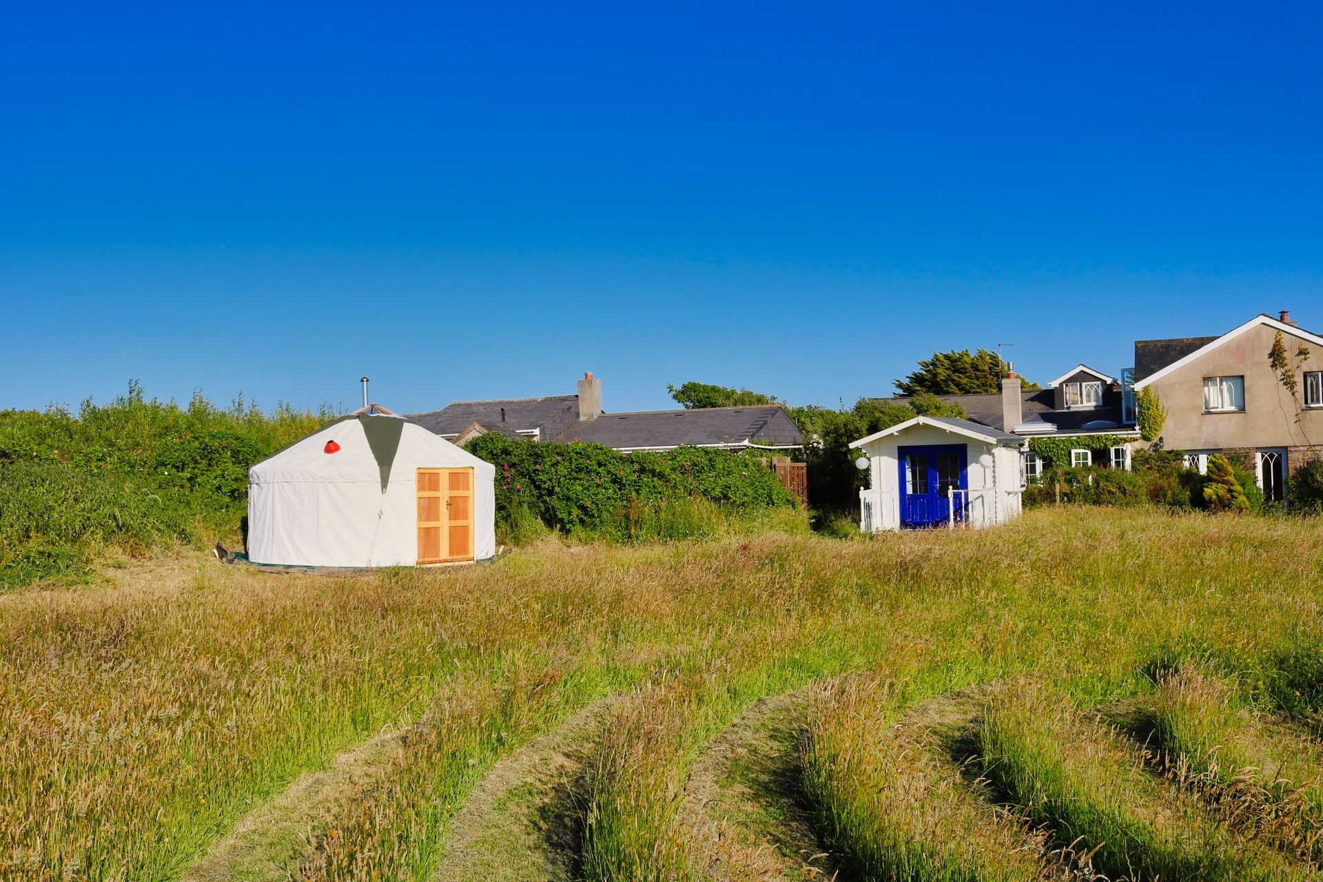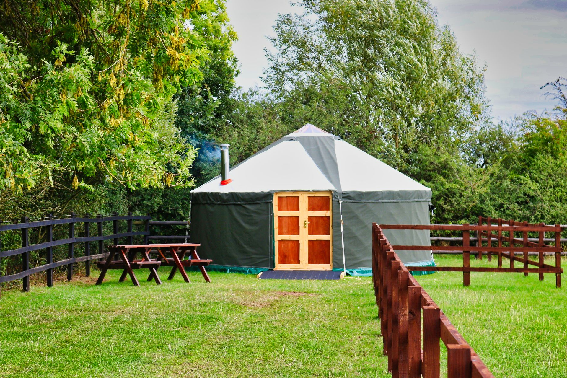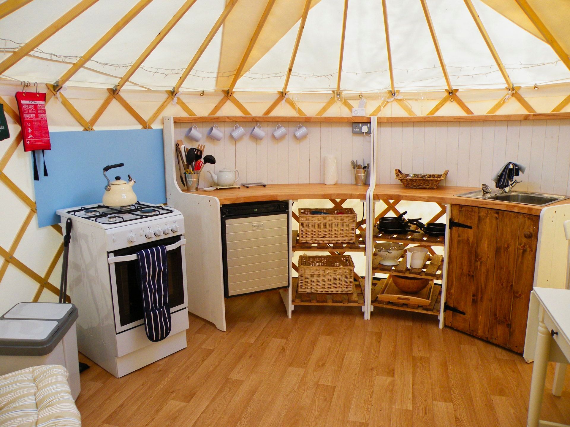 Glamping site: three interconnected yurts, one bedroom, kitchen and dining plus bathroom